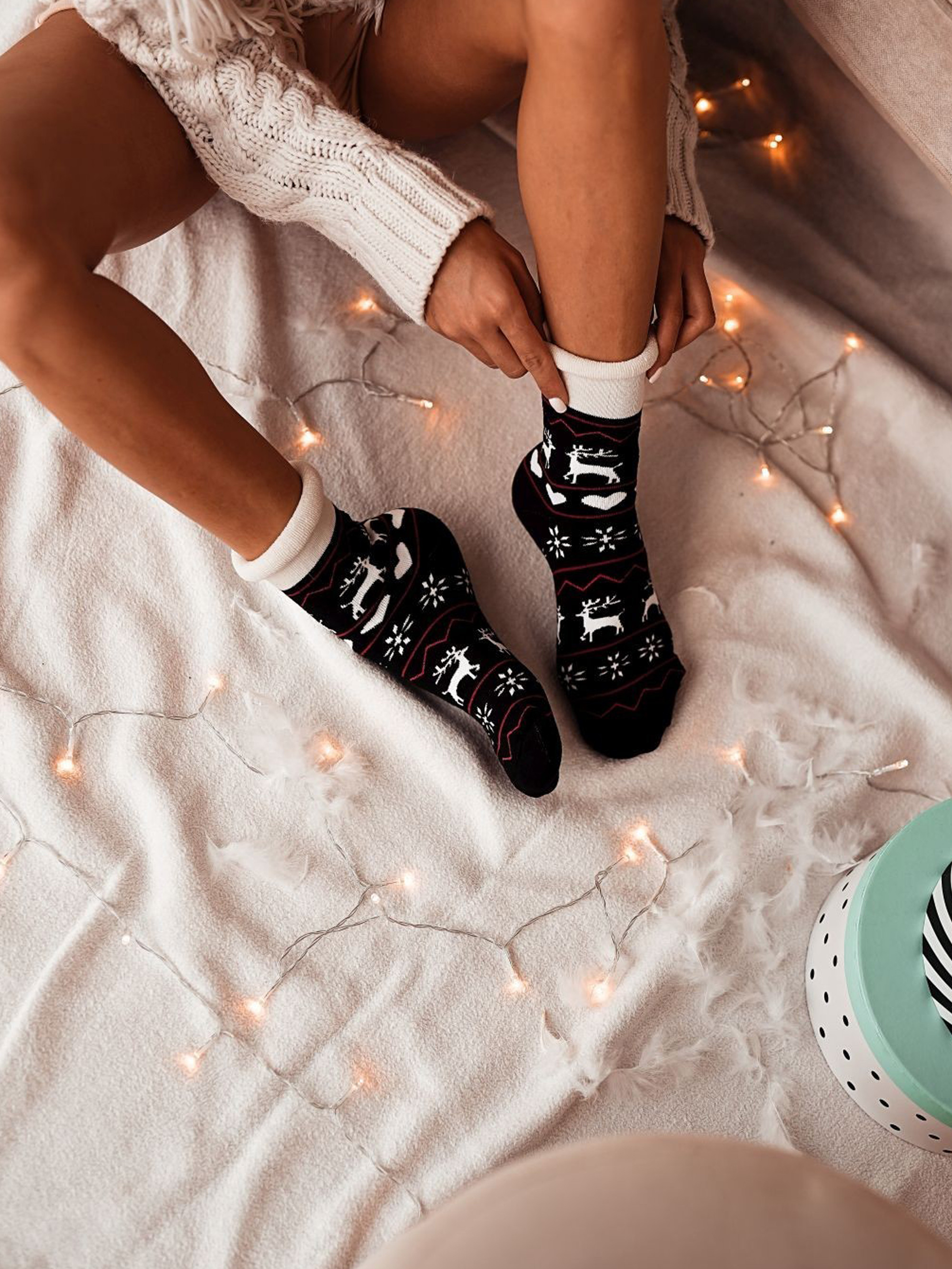 Cotton terry socks in Christmas patterns featuring reindeers, snowflakes and hearts on a deep black or intensive red background. Available in three charming versions, with a comfortable, contrasting, white or mustard welt.