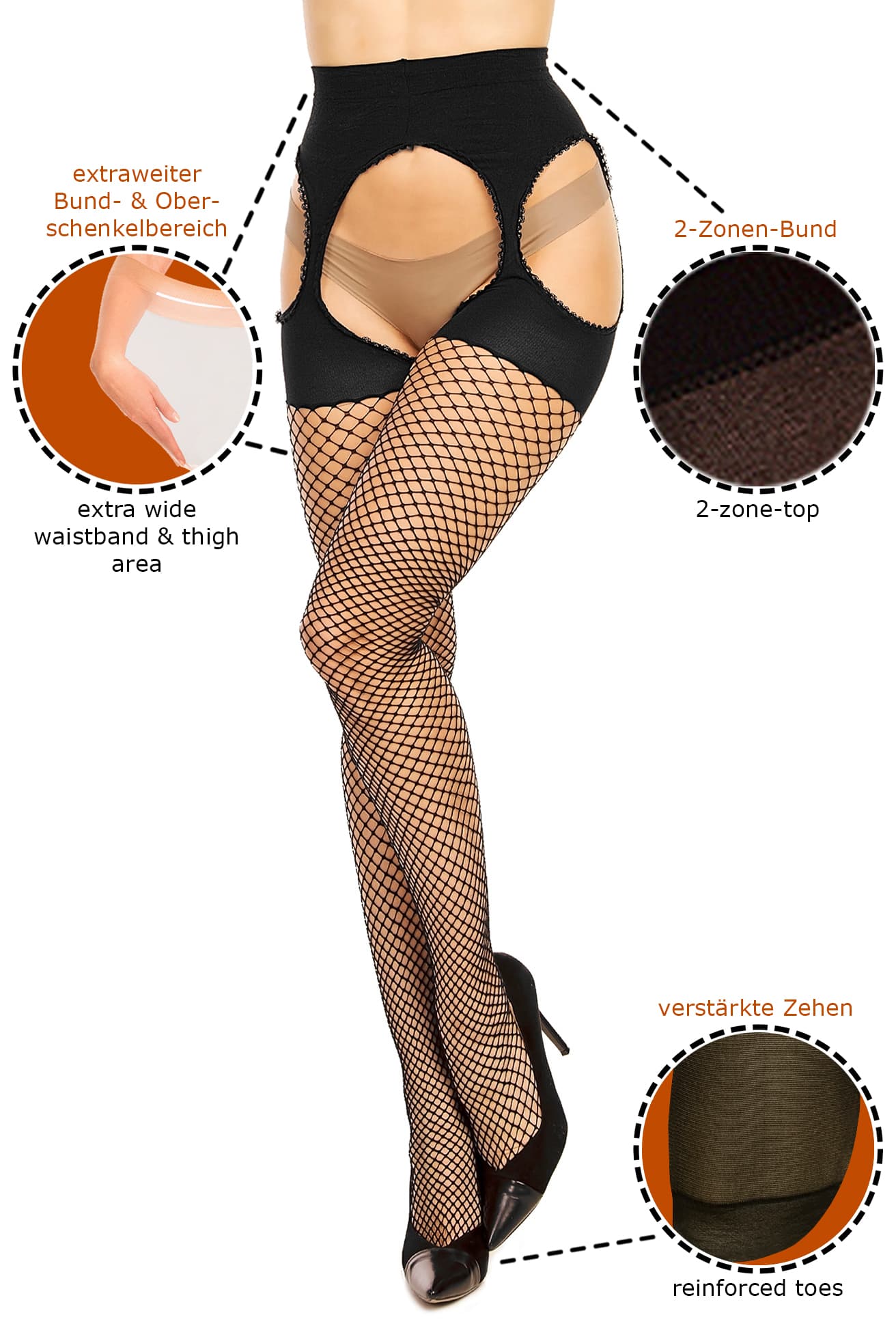 Collants résille ouverts, effet résille en microfibre, zone de cuisse extra large, très confortables à porter, ajustement parfait, orteil renforcé, allie la liberté des bas avec la sécurité de porter des collants confortables.