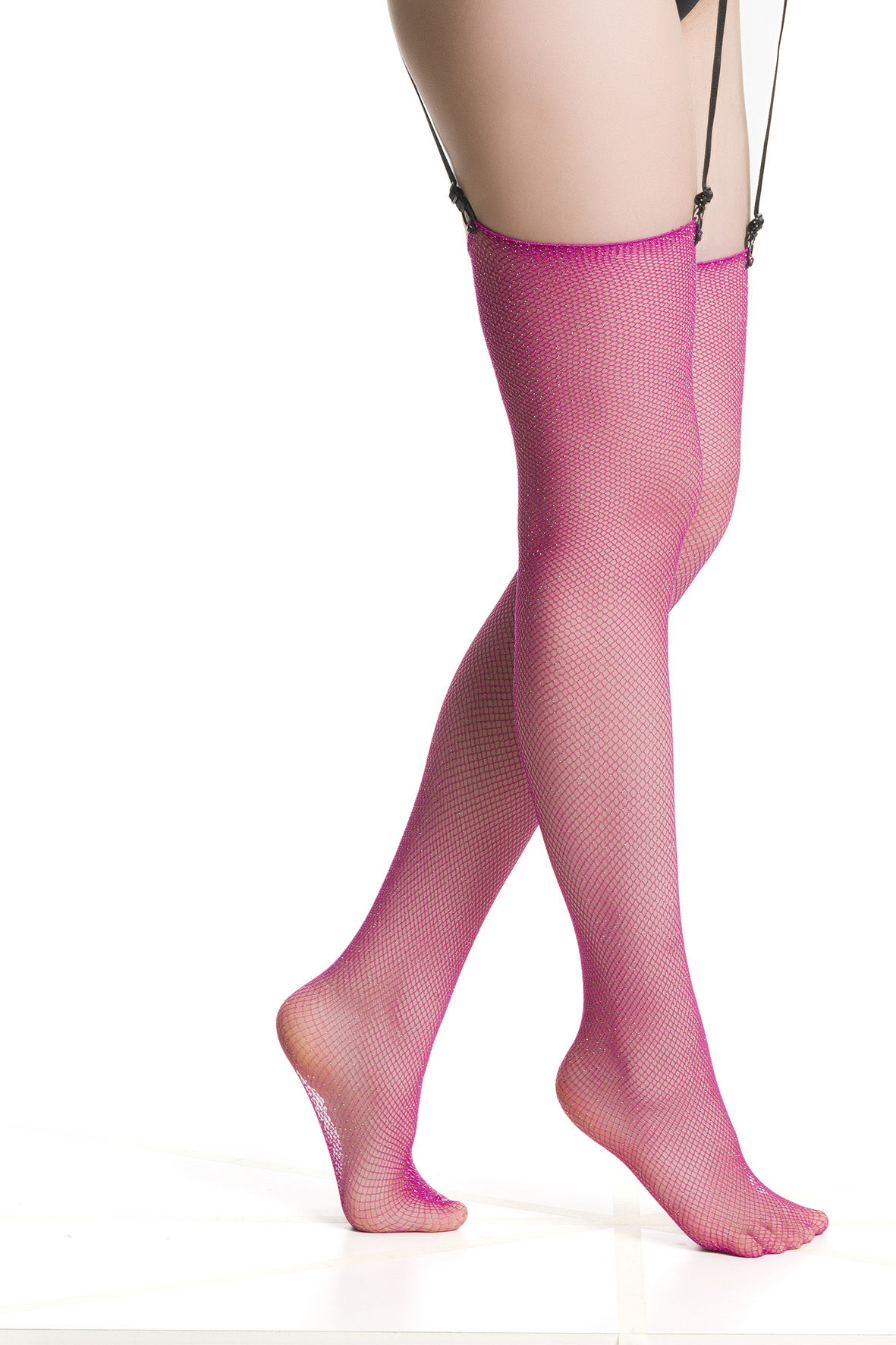 Fishnet stockings with silver lurex-effect. Discover the elegance and sensuality of our fishnet stockings with silver lurex details. Seamless raw cut design for an impeccable fit, maximum comfort and freedom of movement. Perfect for a sophisticated and seductive look.